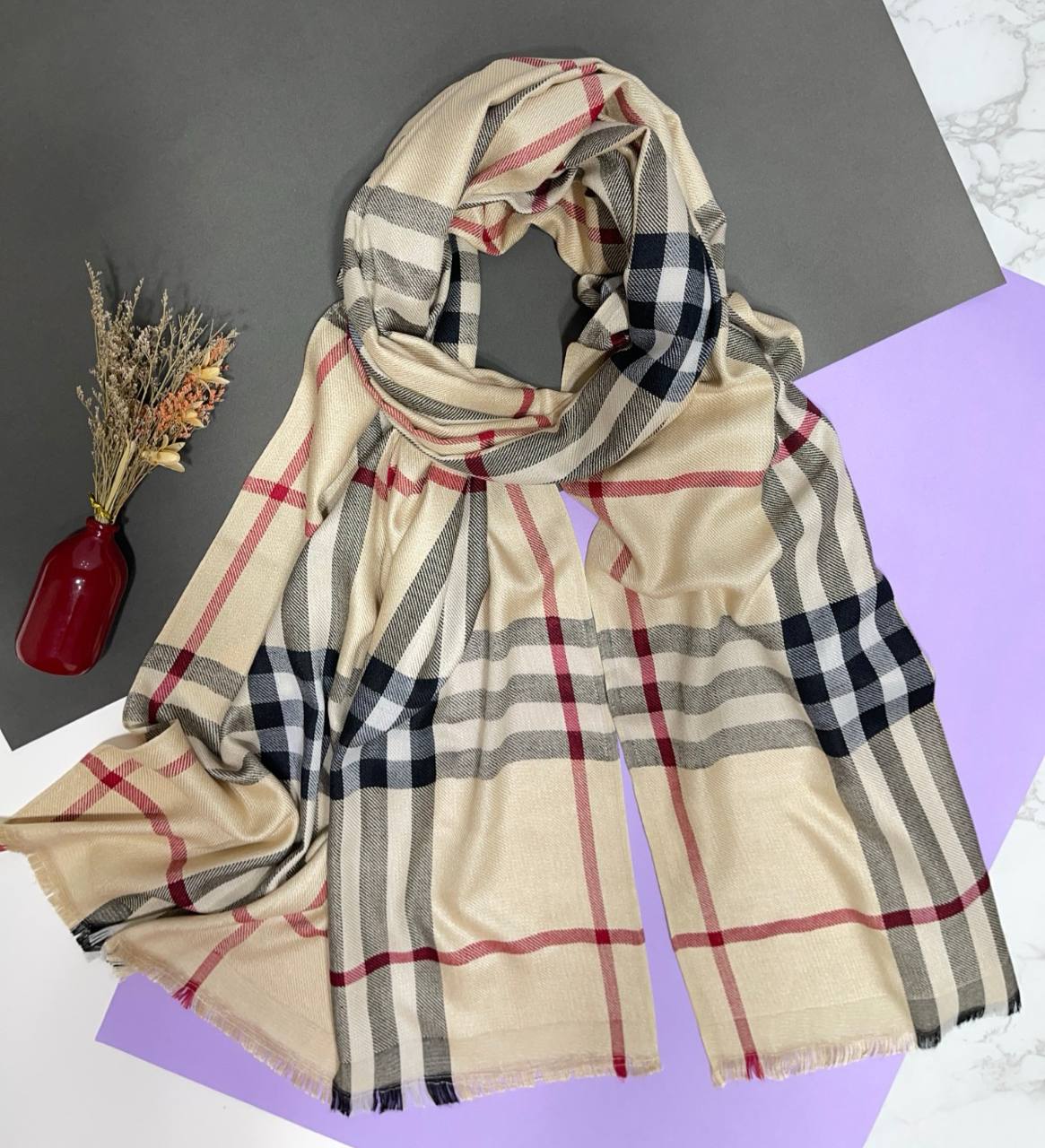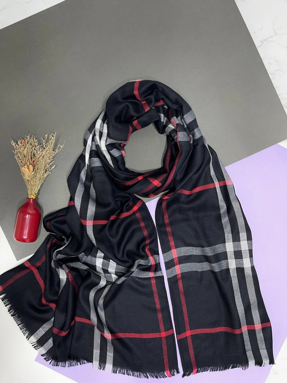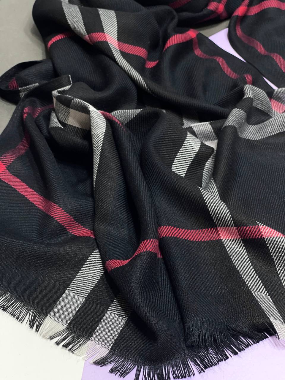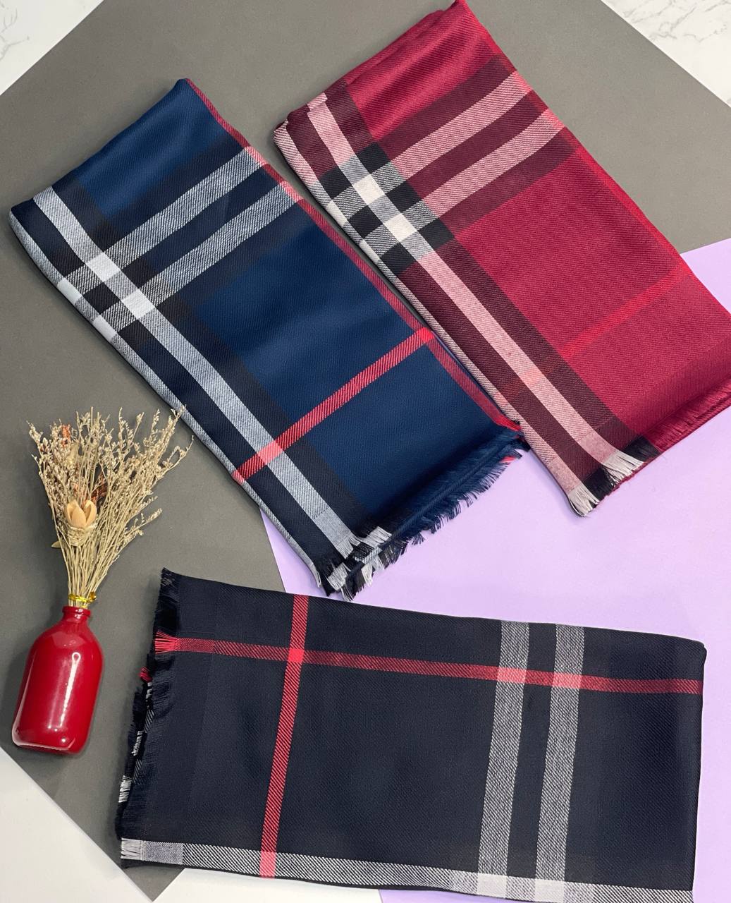 شال نخی پاییزه بربری – ترکیب کلاس و لطافت. شالی شیک و چهارفصل با بافت نرم و لطیف که با پترن معروف برند بربری طراحی شده است. ترکیب رنگهای مشکی، سرمهای، کرم و زرشکی جلوهای خاص و کلاسیک به استایل شما میبخشد. این شال سبک و در عین حال گرم بوده و انتخابی ایدهآل برای روزهای خنک پاییزی است.مناسب برای استایل روزمره و رسمی، با ایستایی عالی و ظاهری بینقص.